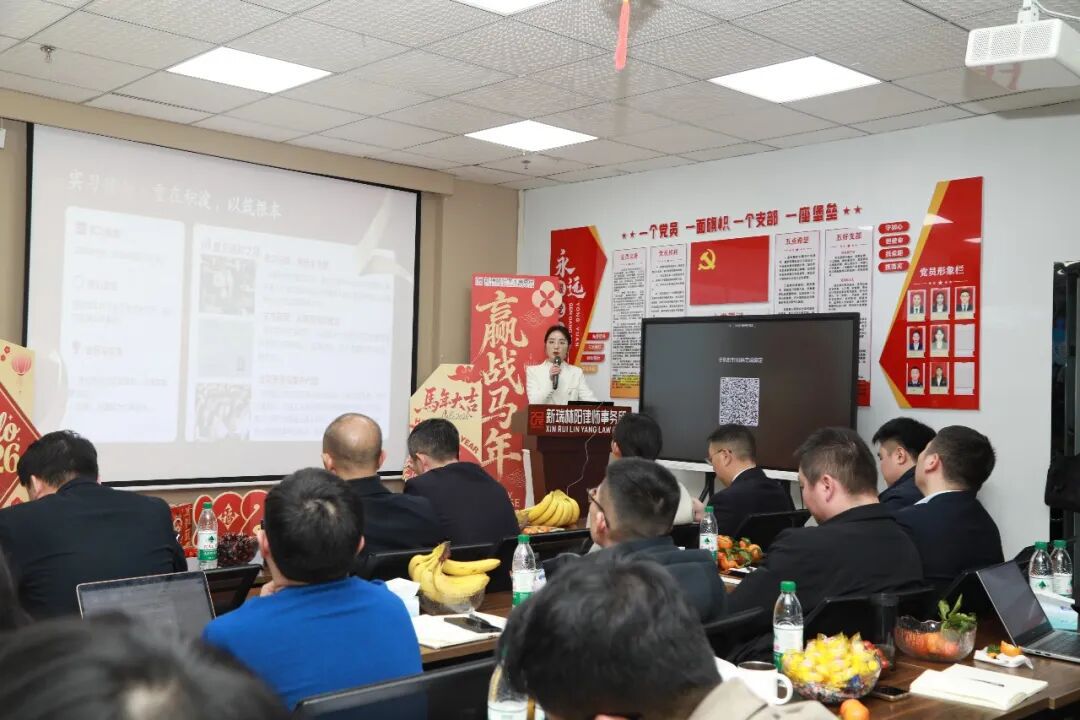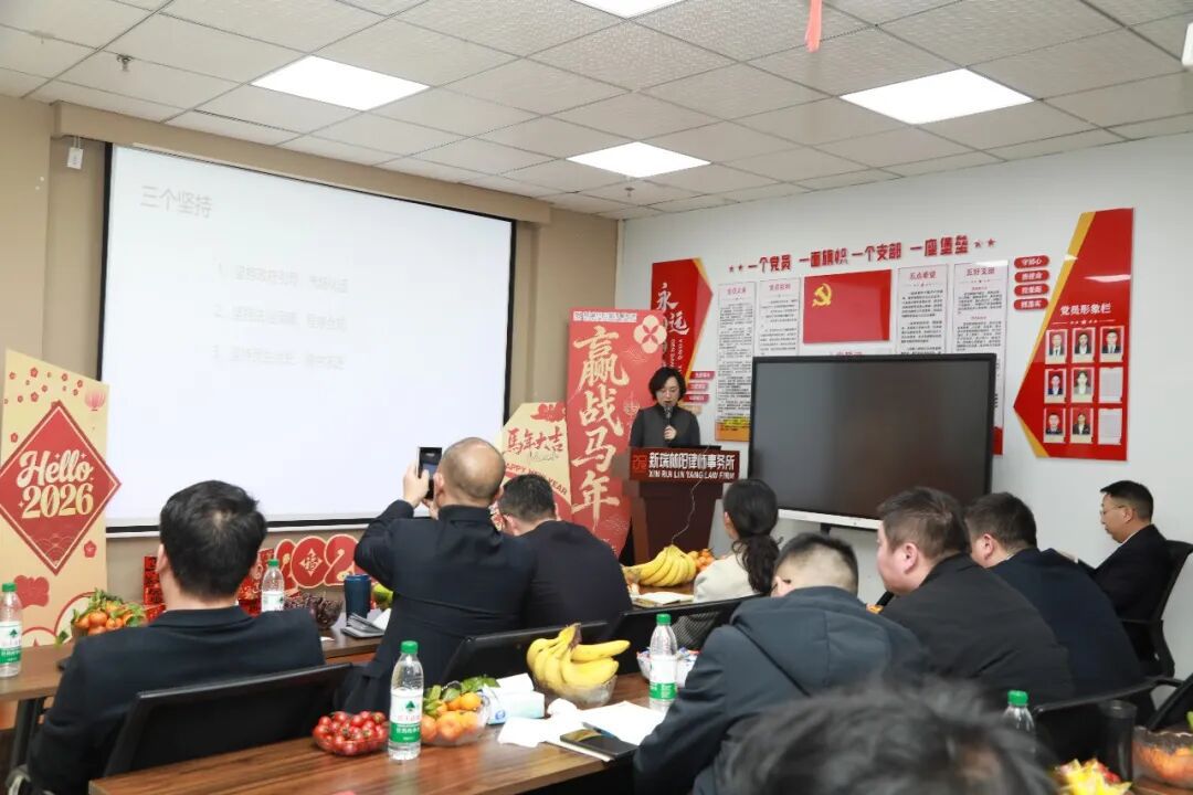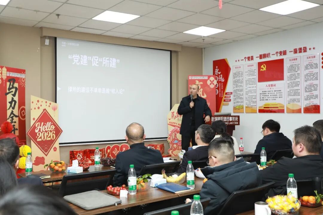 接着,由律所党支部书记、合伙人郭龙律师发言,他首先对2025年新瑞林阳律所党支部开展的主要工作、取得的成绩和存在的不足进行了总结,然后他围绕“党建如何促所建”和“青年律师是否需要入党”这两个话题进行了分享,他认为党建和所建不矛盾,两者相互融合、互相促进,新的一年律所党支部将更加重视党建工作,并为律所的发展赋能;同时,他认为青年律师应该积极向党组织靠拢,通过学习党的历史、了解党的政策、运用党的理论来拓展案件、服务客户和化解纠纷有百利而无一害。