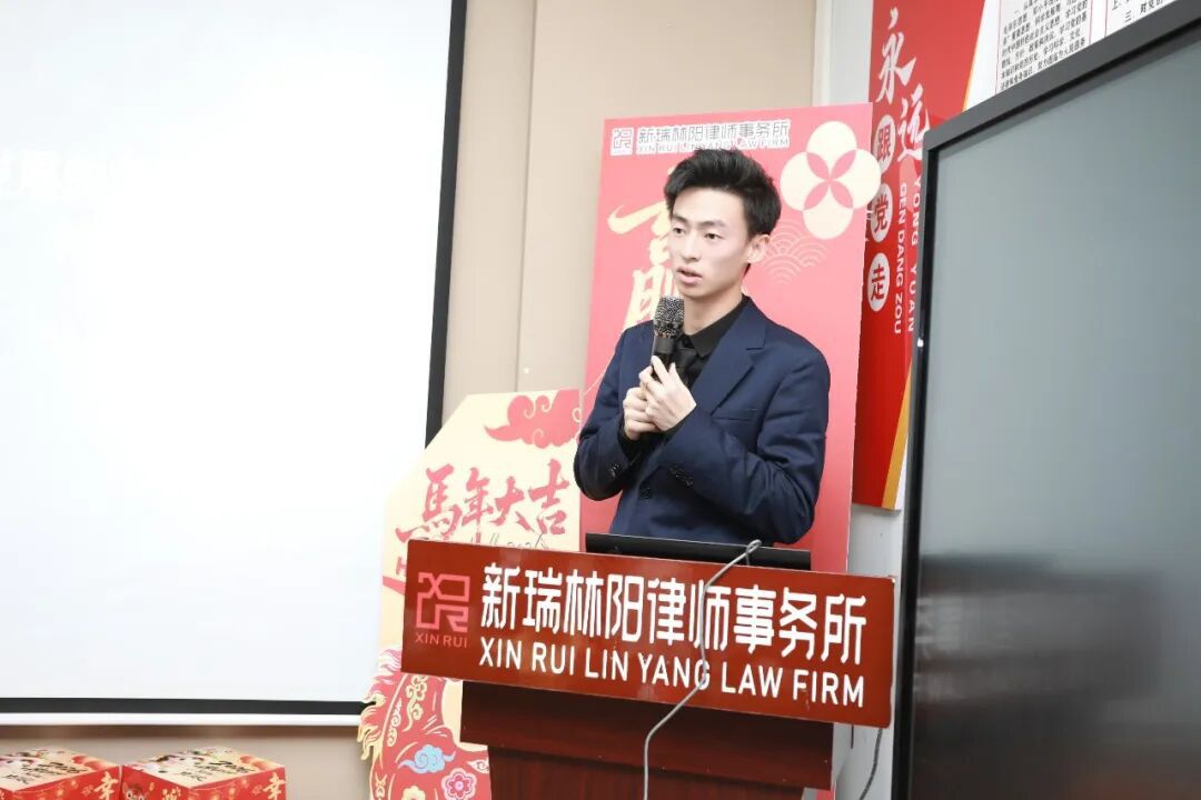 郭龙书记发言结束后,律所王化洋主任对本次年会作总结发言,他首先表达“今天非常幸福和非常感动,幸福的是从律所已经不是我一个人在战斗,感动的是看见各位年轻律师的成长和进步,感动的是新瑞林阳的办所理念和专业优势得到大家的认可和赞同”,他随后说到“在座的各位才是律所的主人和律所的客户,我们合伙人应该为各位做好全方位赋能,为大家专业能力的增长和收入的增长而不懈努力”;同时,他对本次七位主题发言人及其发言内容表示高度肯定,并对部分年轻律师的深度思考表示充分赞许,希望大家在日常学习和工作既要“比学赶超、良性竞争”,又要“团结协作、互相配合”,达到1+1>2目的。最后,他向大家送上了诚挚的新春祝福!