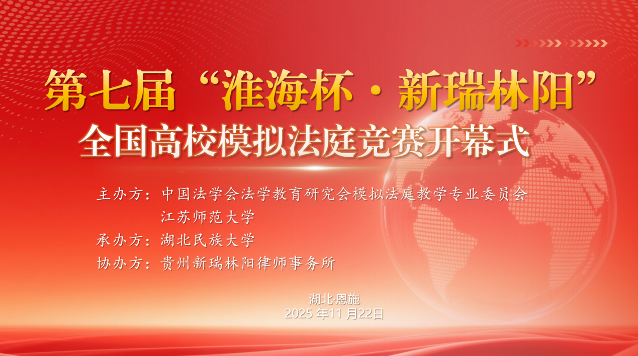 2025年11月22日,第七届“淮海杯・新瑞林阳”全国高校模拟法庭竞赛在湖北民族大学开幕。本次赛事由中国法学会法学教育研究会模拟法庭教学专业委员会与江苏师范大学联合主办,湖北民族大学承办,贵州新瑞林阳律师事务所协办,全国48所高校参赛队伍同台竞技。本次赛事初赛、复赛及1/4决赛线上举行,半决赛与决赛将于线下开展。