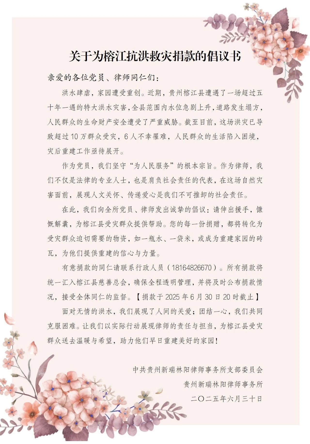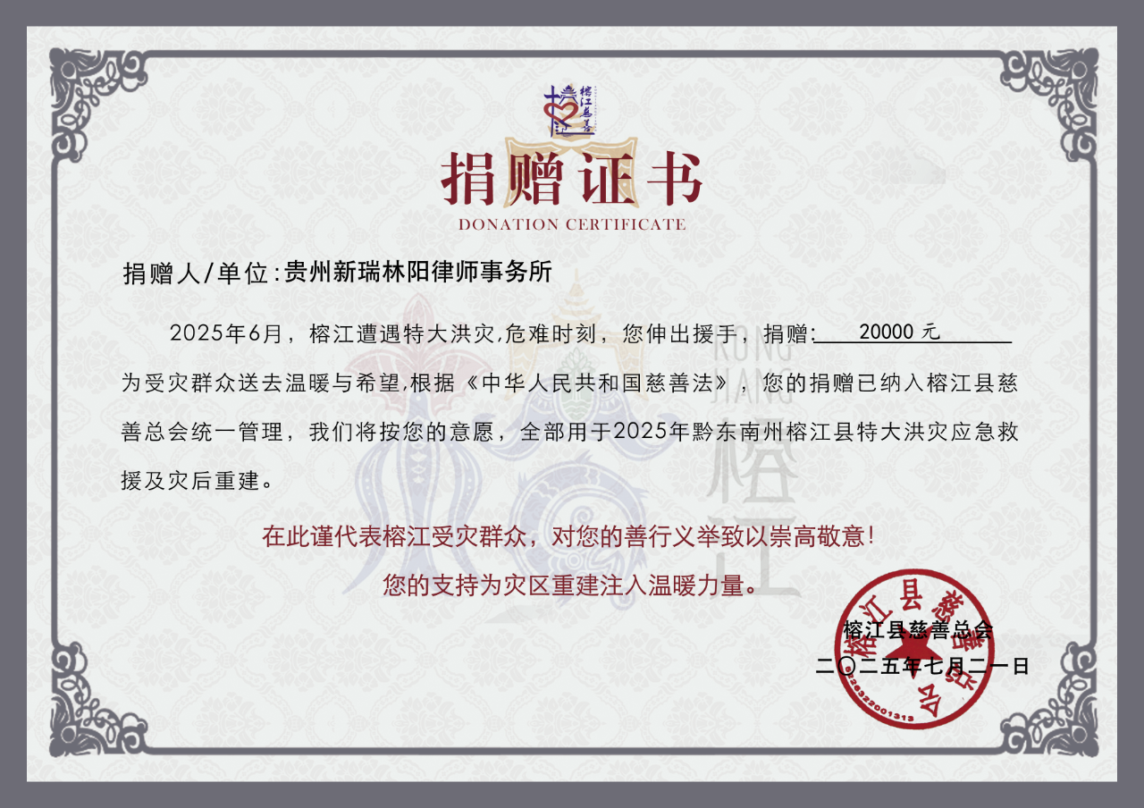 2025年6月24日,贵州省榕江县遭遇历史罕见的特大暴雨袭击,引发严重洪涝灾害。洪水肆虐,道路中断,家园被毁,农田淹没,部分群众被迫转移,生产生活遭受重创。贵州新瑞林阳律师事务所发出倡议书后,事务所的各位同仁迅速响应,积极履行社会责任,以实际行动践行法律人的担当与温度。
