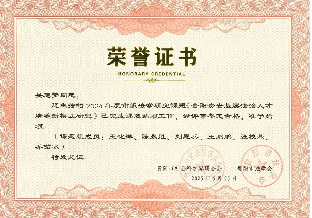 12.2025年6月25日,贵阳市社会科学界联合会、贵阳市法学会对课题研究成果进行评审鉴定,结果为合格,准予结项,并颁发结项荣誉证书。