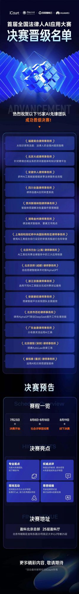 8月19日,李淼律师将带领团队(成员有陈先旭、黄国柱、王化洋、张晓晓、施志洪)前往北京,与来自全国的顶尖AI先锋团队会师总决赛,与全国最优秀的法律科技头脑进行一场激烈的“碰撞”之旅。